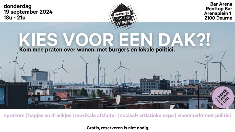 Dit evenement, op het dak van de Arenasporthal, had als doel burgers te informeren over het voorbije en toekomstige woonbeleid in Antwerpen in kader van de lokale verkiezingen in 2024. Met interessante sprekers, gratis hapje en drankje, een sociaal-artistieke expo, een woonmarkt met lokale politici waarbij bezoekers de kans kregen om in gesprek te gaan én muzikale performances.